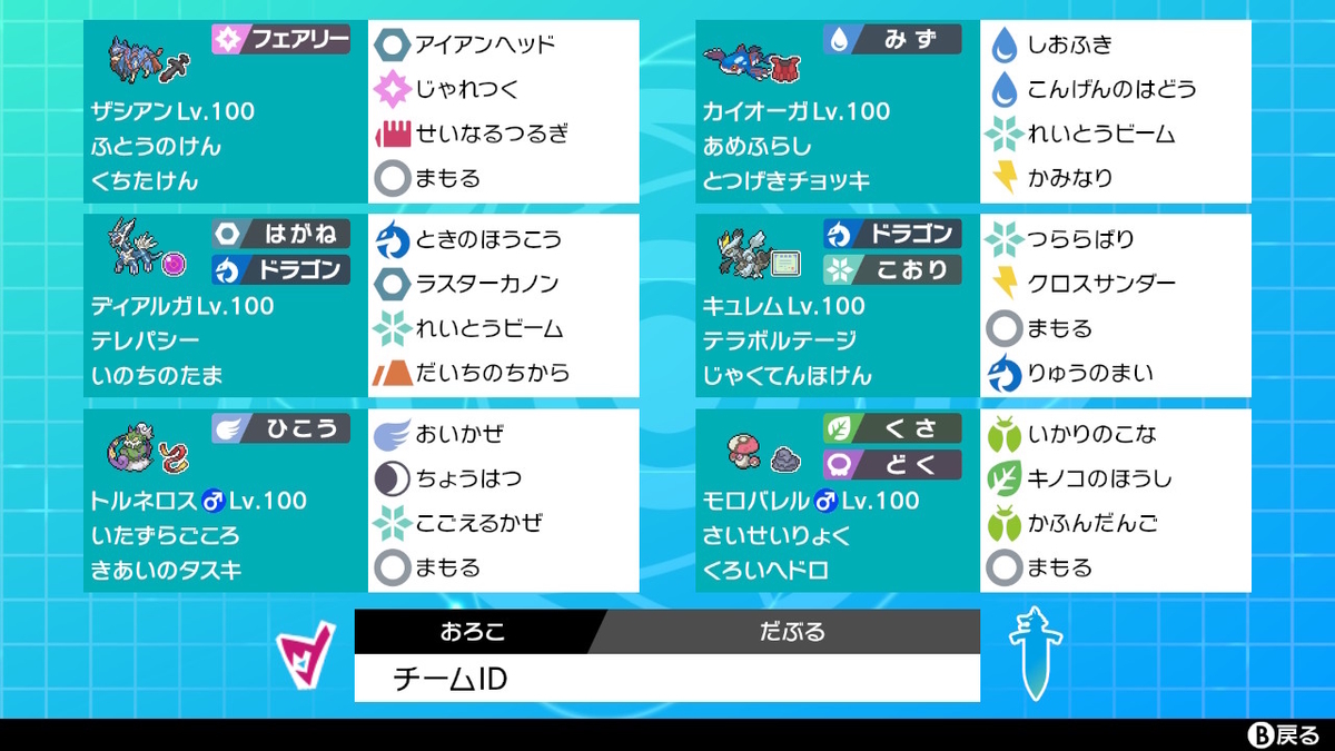 今までのランクマ(ダブルはs26~参加。s31~s34まではお休み。)で使っていた禁伝たちとサポートしてくれるポケモンを雑に招集して完成!